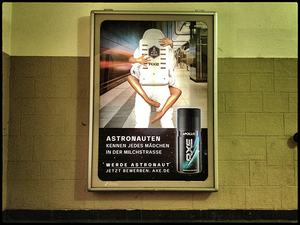 Unsere Bahnhöfe sind voll davon. Eine Werbekampagne von AXE weckt mancher Jungen – nicht Meinigen – kindlichen Berufswunsch nach dem eines Astronauten. Astronaut, ein etwas in das Vergessen geratener „Beruf“. Einen den man meines Wissens nach nicht erlernen kann – man wird dazu berufen und trainiert. Besondere Fähigkeiten nicht nur physischer Art sind erwünscht. Kein Muss – vermutlich nicht gegen den eigenen Willen. Eher schon eine Ehrensache. Der Begriff Astronaut (v. griechisch ἄστρον astron = Stern + ναύτης nautēs = Seefahrer/Matrose) lehnt sich an das Wort Aeronaut (Luftschiffer) an. Und übt eine Faszination aus. Eingezwängt in eine Kapsel. Schwerelosigkeit. Unvorstellbare Kräfte die auf einen Wirken. Und natürlich – hier schließe ich mich gerne an – einmal unseren blauen Planeten als Ganzes sehen. Von oben. Außen. Einzigartig.