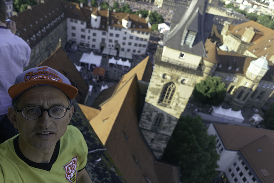 Deshalb um so mehr. Rein ins Getümmel. Mit Verspätung. So spät, dass die Haltestelle am Schlossplatz gesperrt wird. Eröffnungsgottesdienst ade. Und Gauck ist da. Und und und… Und viele Menschen unterwegs. Eine Station weiter und alles ist gut. Von Null auf Hundert. Voll im Kirchentag. Seliges Grinsen. Viele Menschen sind untertrieben. Es sind sehr viele und noch mehr. Mir reicht’s fast schon. Während die Menschen das Schlusslied singen, gehe ich gen Stiftskirche. Turmbesteigung. Zig Stufen. Und die »Hallo Achim«-Begrüßung des Stiftspfarrers. Danke dafür. Willkommen zu sein. Gibt es etwas schöneres. »Wahrlich. Einer der herrlichsten Plätze von Stuttgart. Halleluja!« poste ich umgehend. Unten die Welt. Oben ich. Erhebend. Ein kurzes Vergnügen. Runter gehts. Noch mehr Menschen. Singen. Essen. Selige Fröhlichkeit. Herrlich. Es ist was los in der Stadt. Live-Musik an allen Ecken und Enden. Und Menschen. Eine Sängerin singt klassisches Gesangbuchliedgut in Jazz. Ein Chor aus dem Hohenlohe intoniert ein Karel Gott Lied – übertragen auf eine Videowall die ihres Gleichen sucht. Irgendwann ist auch gut und ich verabschiede mich in den Westen. So oft wollte ich schon ins Fischlabor. Jetzt ist die Zeit. Cheers. Newcastle Brown Ale vom Fass. Herrlich. Herrlich auf eine andere Art und Weise. Weit ist es nicht – trotzdem Blasen gelaufen. Crocs eignen sich nur bedingt für längere Touren. Hätte ich das nur früher gewusst. Psalm 90,12: »damit wir klug werden«. Die KirchentagsIosung. Danke.