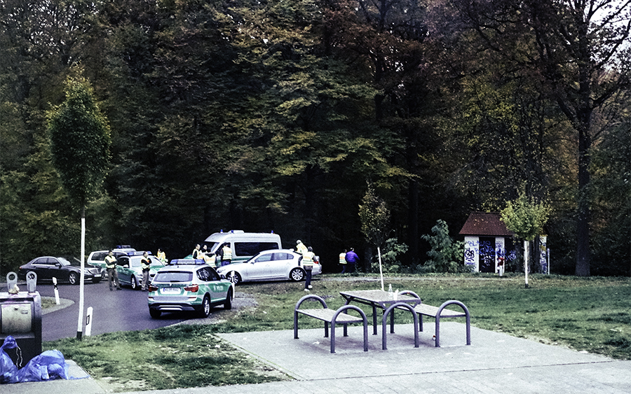 Und der Polizeikastenwagen. In Dreiecksbeziehung zwischen Hütte und den Bussen. Vermeintlich unauffällig. Am Rande. Trotzdem im Mittelpunkt. Mittig eine Sitzgruppe. Unbenutzt.