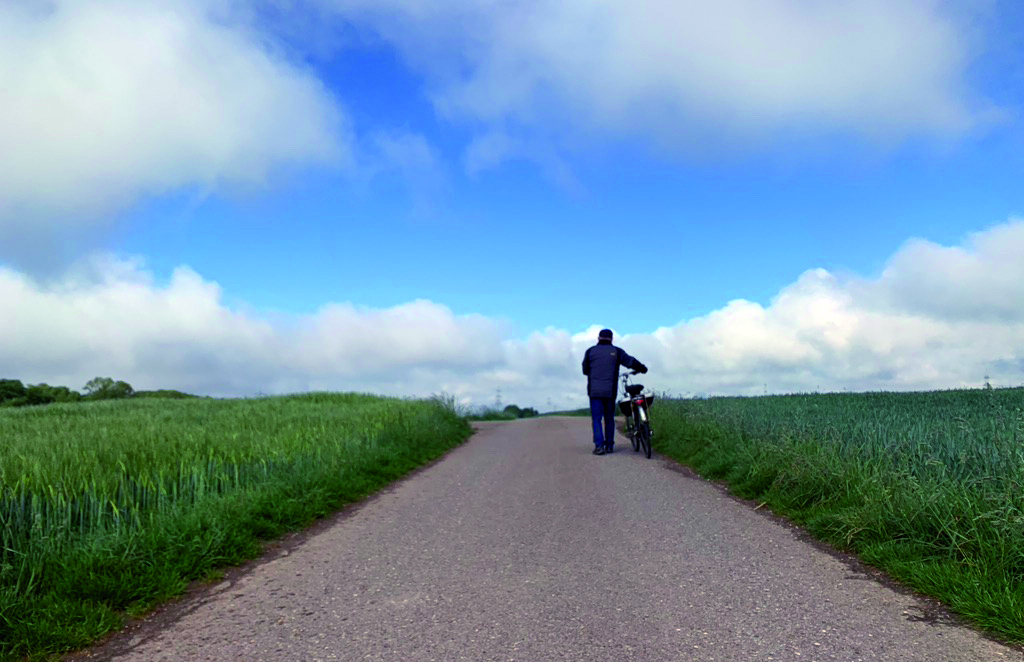 Das Fahrrad. Gewohnt im Rollen zu sein. Schnell. Mal langsam. Es ist gut, wenn dich jemand schiebt. Es ist gut, wenn dich jemand an den Händen nimmt. Die Kraft von außen. Die dich auch sonst nur in Bewegung bringt und hält. Im Wissen, dass beides gebraucht wird. Das Rad und den Menschen – im übertragenen Sinn. Alles.