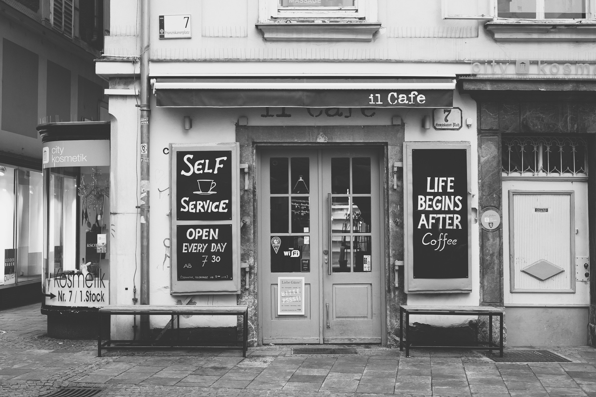 Zentrum. Brücke. Gassen. Kunsthaus. Dom. Pizzeria. Café. Dann wird es dunkel und ich will zurück ins Hotel. Nachts und alleine in einer fremden Stadt ist nicht so meines. Ich erinnere mich an furchtlose Zeiten. Quer durch New York. Mitternacht. Furchtlos ist nicht das richtige Wort.