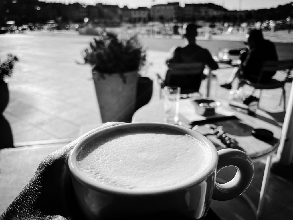 Ich sitze an einem lebendigen Ort, der vor einer Stunde eine unglaubliche Ruhe ausstrahlt. Langsam immer lebendiger wird. Sicht- und scheinbares Leben kommt in die Stadt. Ja laut. Ja, ich bin angekommen, trinke einen Kaffee. Sitze am Meer. Um mich herum wird es umtriebiger. Ruhe war. Es ist trotzdem noch schön. Die Sonne wird kräftiger und hat nicht mehr den Scharm der Morgensonne. Die Stühle füllen sich mehr und mehr. Bald wird es keinen freien Platz geben. Dann wird es Zeit zu gehen. Platz schaffen.